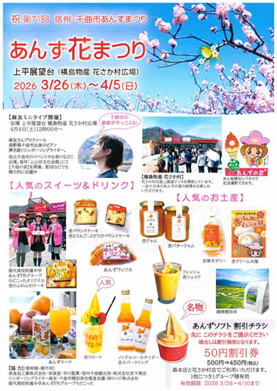 当館からお車で約30分、日本一のあんずの里で「あんずまつり」が毎年開催されます。「一目十万本」といわれるだけあり、山も里も、一面うす桃色に染まった景色は圧巻です。桜より一足早く花開くあんずの里で春をお楽しみください。市内の様々なあんず商品やあんずのスイーツや信州のあんずのお土産が勢ぞろい!