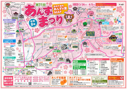 当館からお車で約30分、日本一のあんずの里で「あんずまつり」が毎年開催されます。「一目十万本」といわれるだけあり、山も里も、一面うす桃色に染まった景色は圧巻です。桜より一足早く花開くあんずの里で春をお楽しみください。市内の様々なあんず商品やあんずのスイーツや信州のあんずのお土産が勢ぞろい!
